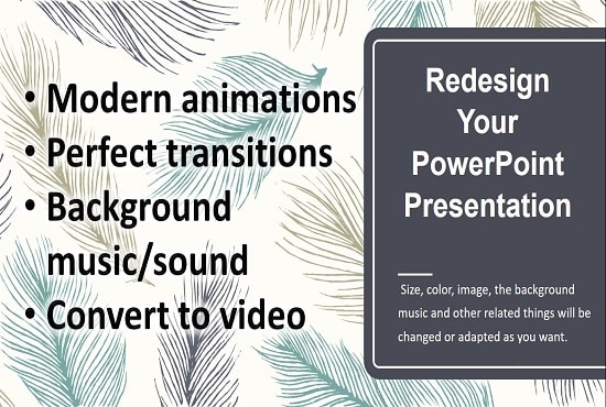 You have to send me whatever you have/want on every slide or just instructions for every slide. I will redesign it and make it a branded Powerpoint presentation. The design will be perfect, just like you instruct me. Size, color, image, the background music and other related things will be changed or adapted as you want. Don't love the design? I provide full refund if not satisfied. So, no worries!